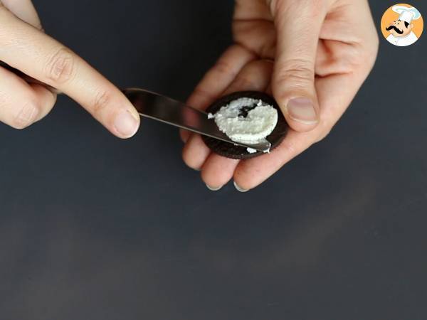 Togliete la crema dagli Oreo triturateli. In una ciotola a parte, mescolate la panna liquida (calda) con il cioccolato fondente per realizzare la ganache.