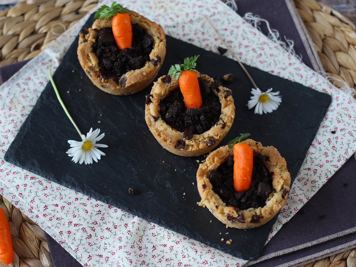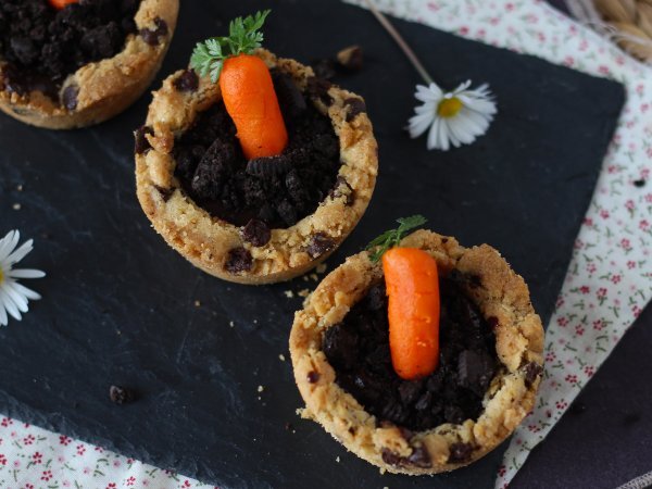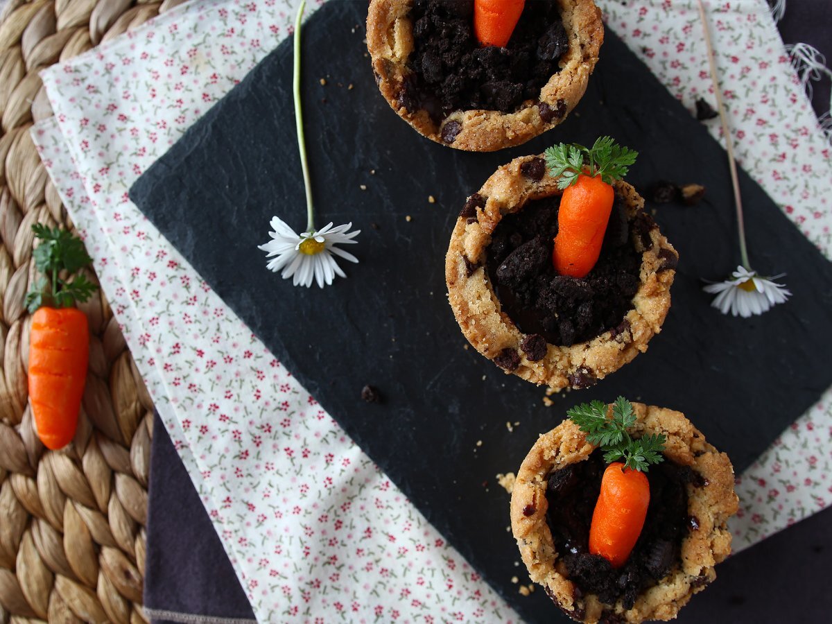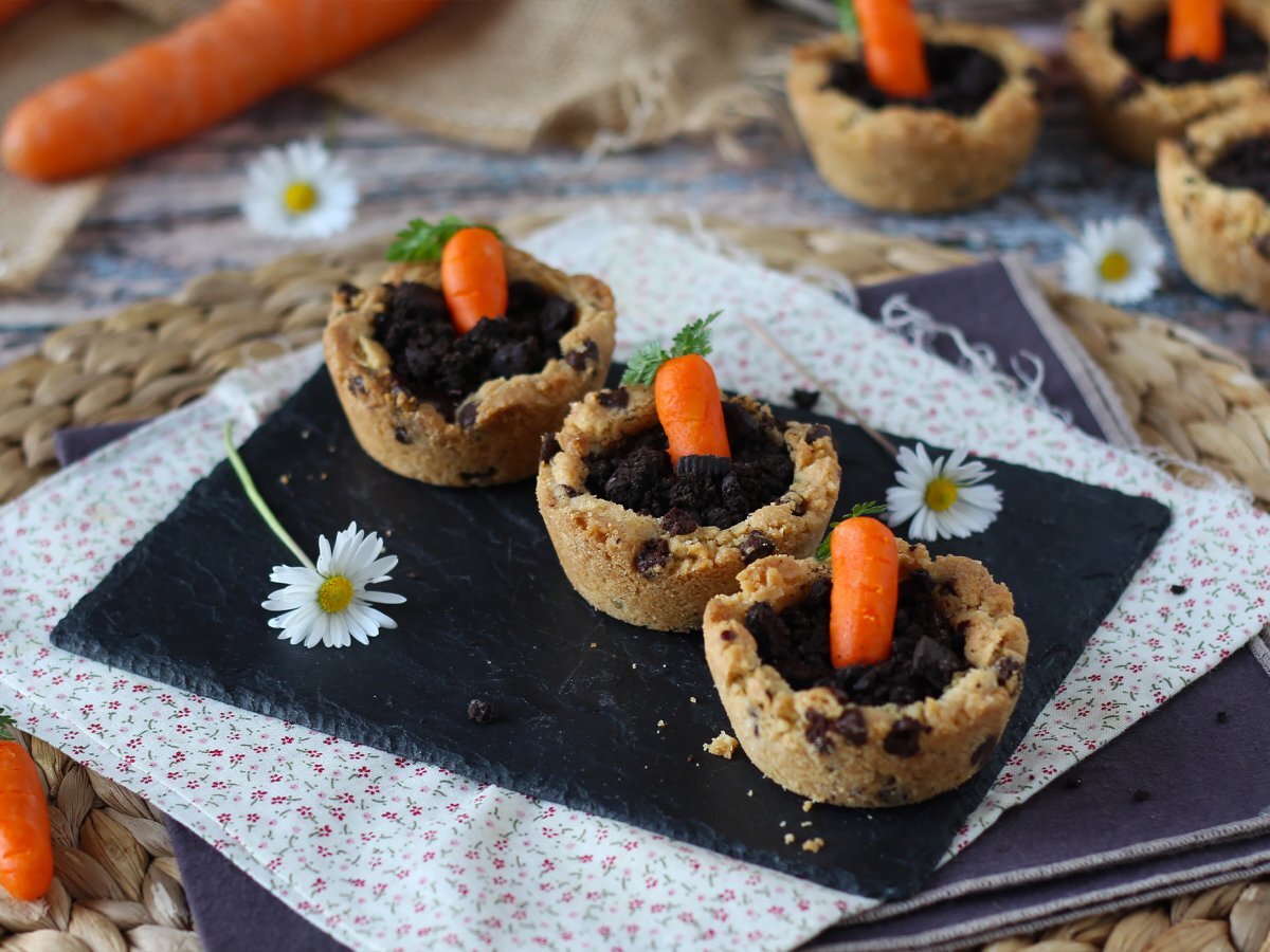 Cookie cups al cioccolato con carote di pasta di mandorla