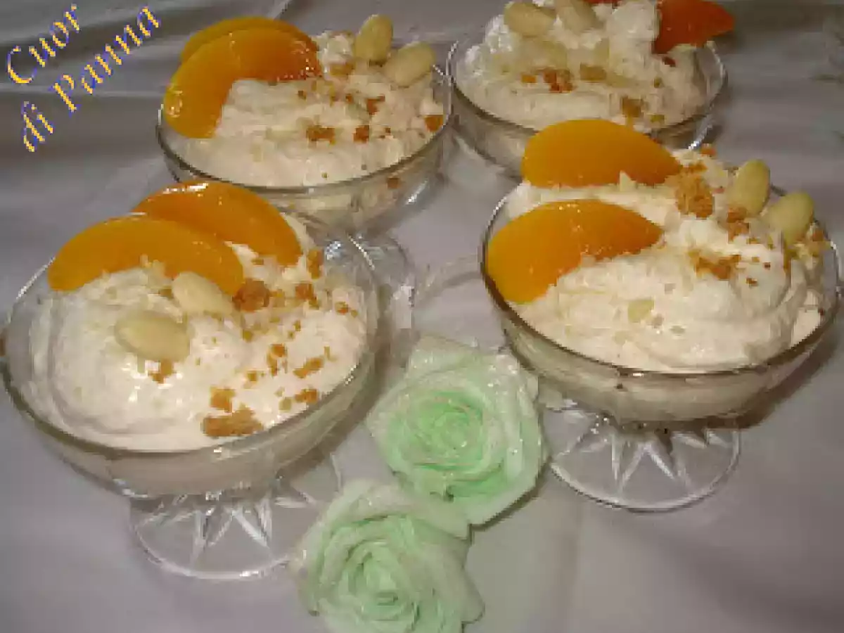 Coppe alla mousse di pesche e mandorle vota adesso Dessertmedia30 min Invia questa ricetta ad un amico Stampa la ricetta Contatta l'autore della Ricetta Pubblica la foto di questa ricetta Ingredienti 10 Per la mousse di pesche: 400 g di pesche 3 cucchiai di zucchero ½ limone 500 ml di panna da montare già zuccherata Extra: mandorle pesche pan di spagna liquore a scelta