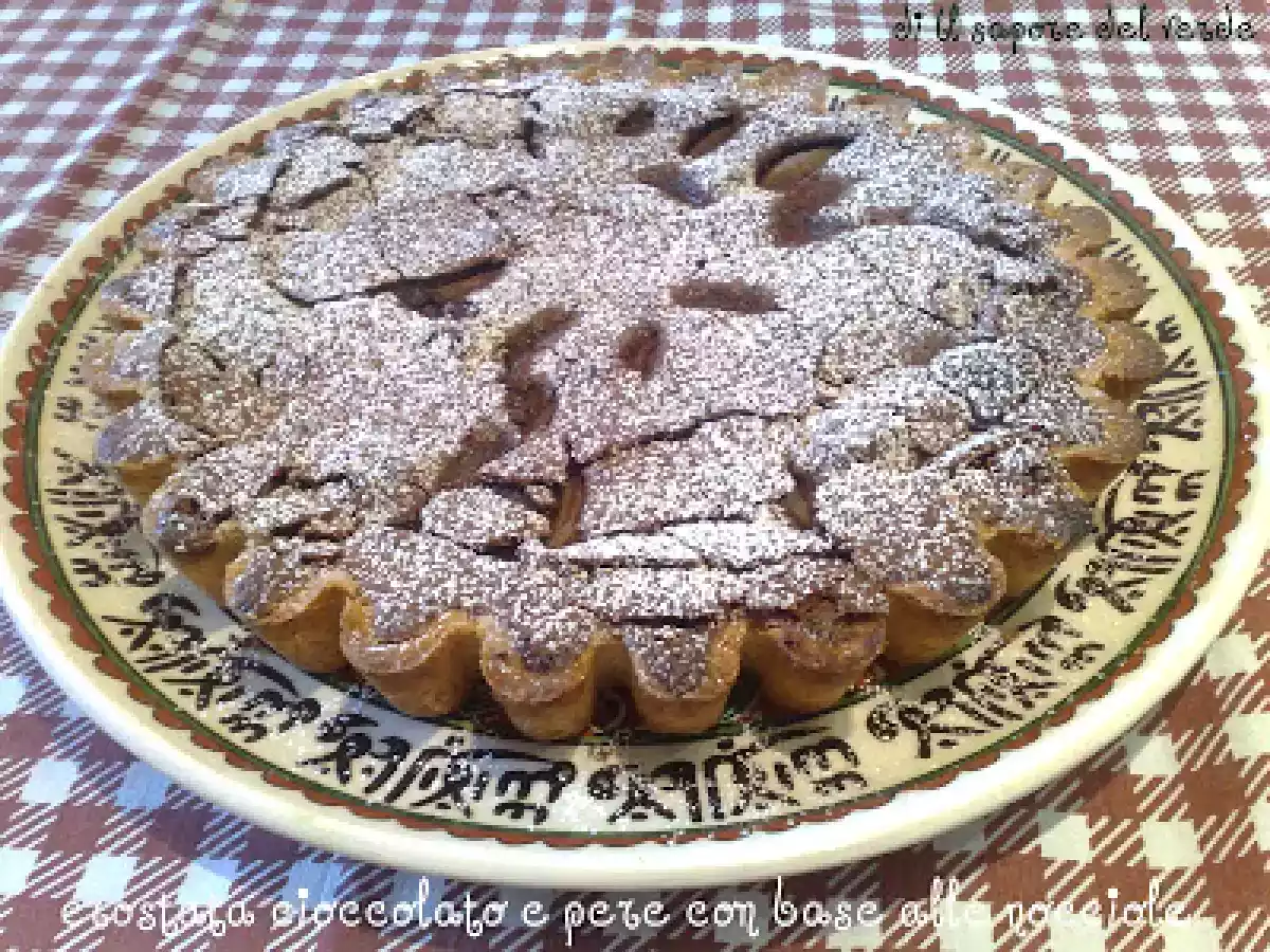 Crostata cioccolato e pere con base alle nocciole Dessertfacile30 min Invia questa ricetta ad un amico Stampa la ricetta Contatta l'autore della Ricetta Pubblica la foto di questa ricetta Ingredienti 6 Per la frolla alle nocciole 140 g di farina, 15 g di nocciole tritate, 60 g di zucchero, 90 g di burro morbido, 1 tuorlo, 1 cucchiaino di lievito in polvere, un pizzico di sale. Per la farcia 100 g di cioccolato fondante, 20 g di cacao in polvere, 3 uova, 130 g di zucchero, 100 ml di panna fresca, 25 g di mandorle in polvere, pere sciroppate