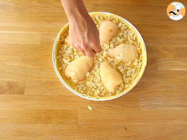 Tagliate a fettine sottili le pere nel senso della larghezza cercando di mantenere integra la forma del frutto (date un'occhiata alla video ricetta). Poi adagiatele sulla crema di mandorle