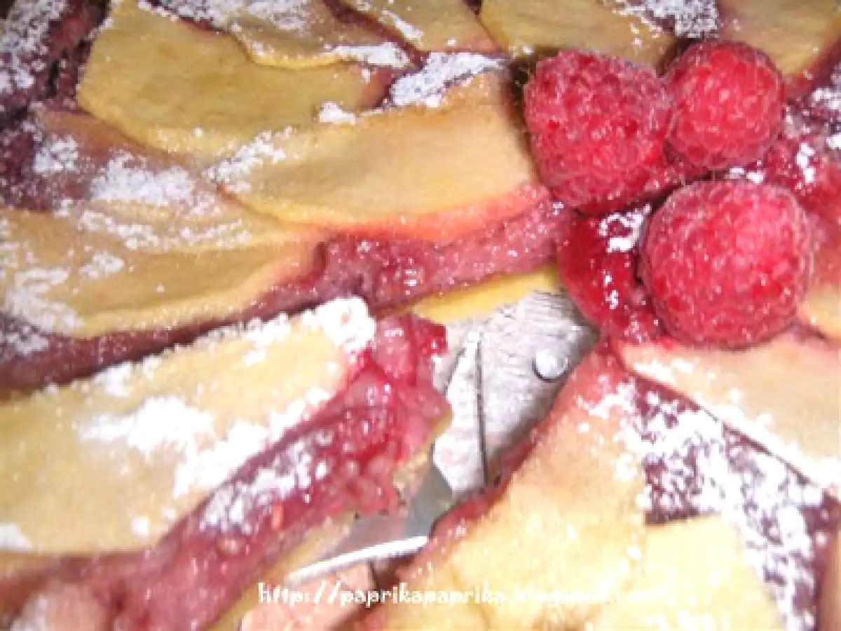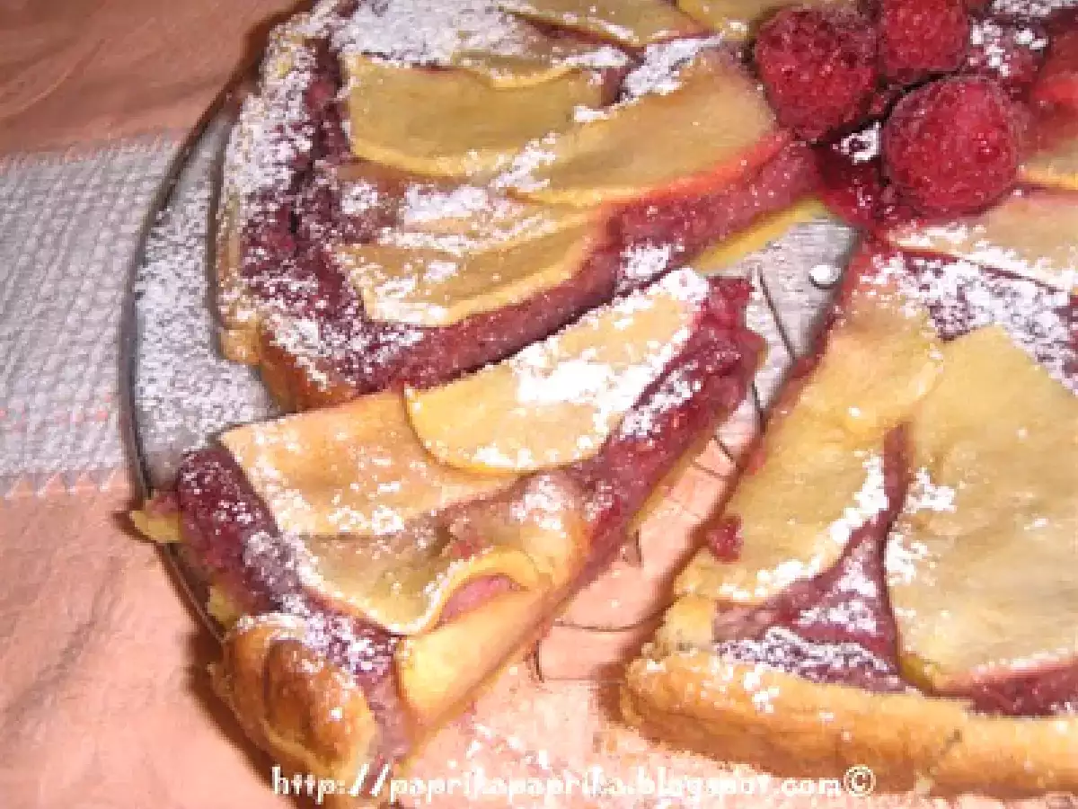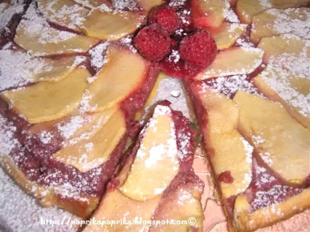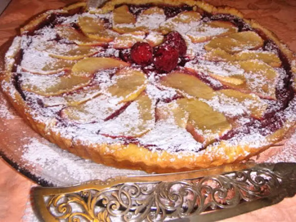 Crostata frangipane al lampone e mele _màlnàs mandulatorta vota adesso PrecedenteProssimo Dessertfacile1 h 15 m Invia questa ricetta ad un amico Stampa la ricetta Contatta l'autore della Ricetta Pubblica la foto di questa ricetta Ingredienti 3 1) Pasta frolla farina 00 300 g : burro 150 g zucchero 50 g panna fresca 50 g un turolomezza bustina di vanilina sale 2) Farcia e guarnizione lamponi fresci 130 g : burro 70 g zucchero a velo 70 g farina di mandorle 70 g zucchero semolato 60 g una mela golden un uovo zucchero grezzo sale