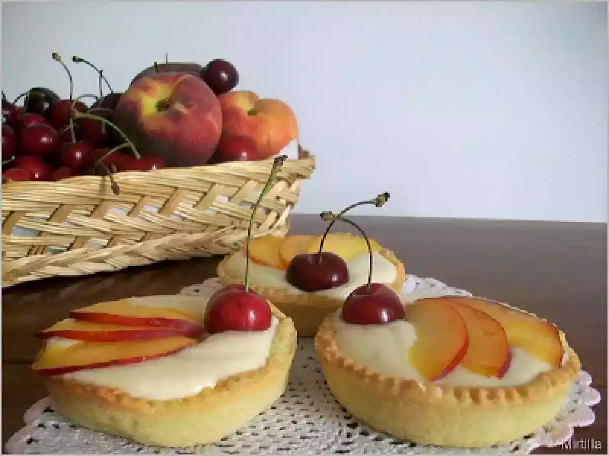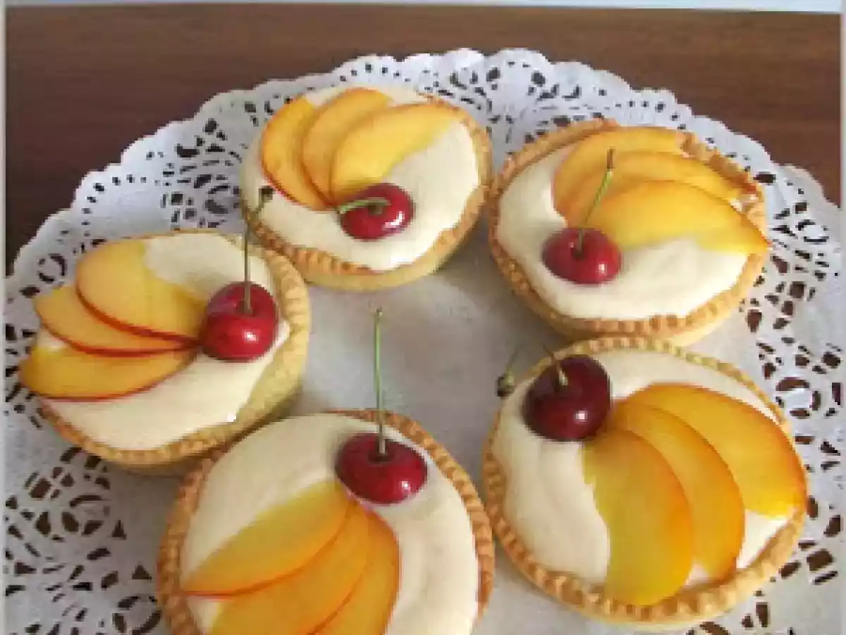 Crostatine con mousse di ricotta e pesche vota adesso PrecedenteProssimo Dessertfacile45 min Invia questa ricetta ad un amico Stampa la ricetta Contatta l'autore della Ricetta Pubblica la foto di questa ricetta Ingredienti 4 Per la Pasta Frolla: 280 g di farina 00 100 g di zucchero a velo 140 g di burro; 1 uovo 30 g di mandorle Per la Mousse di Ricotta: 200 g di pesche 200 g di ricotta fresca 100 g di zucchero semolato 1 dl di panna fresca da montare 1 baccello di vaniglia 2 cucchiai di Maraschino 4 g di gelatina