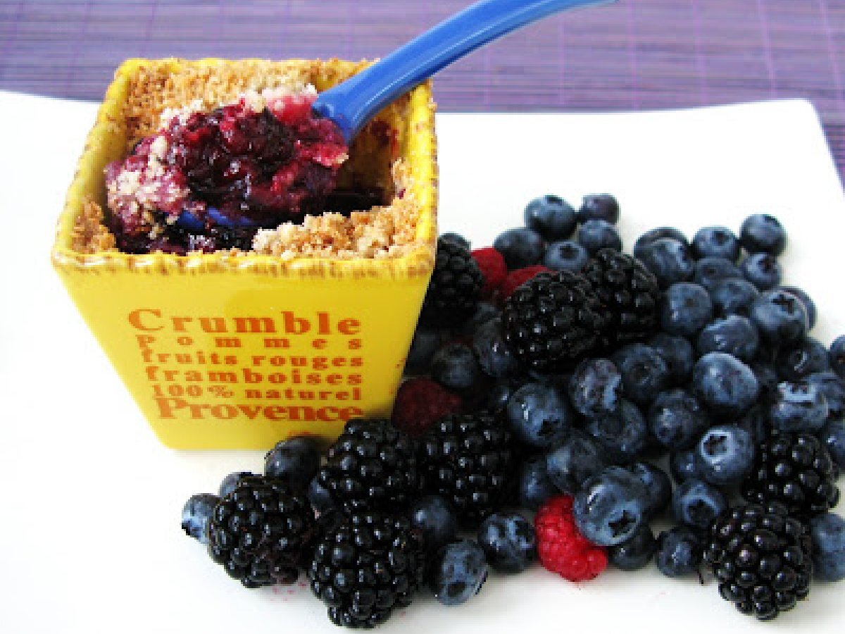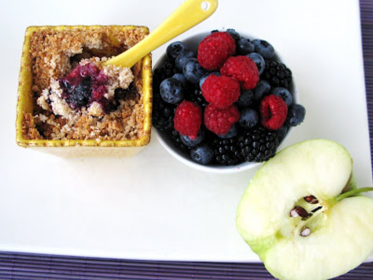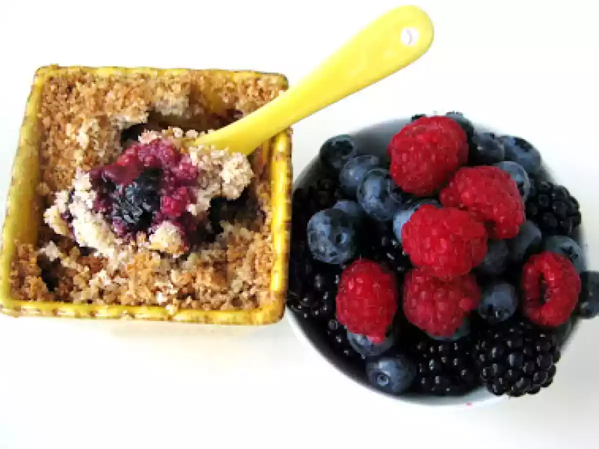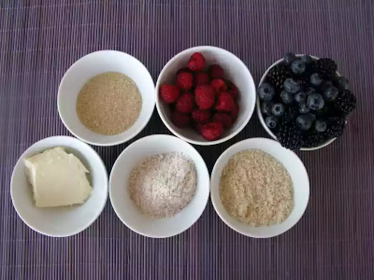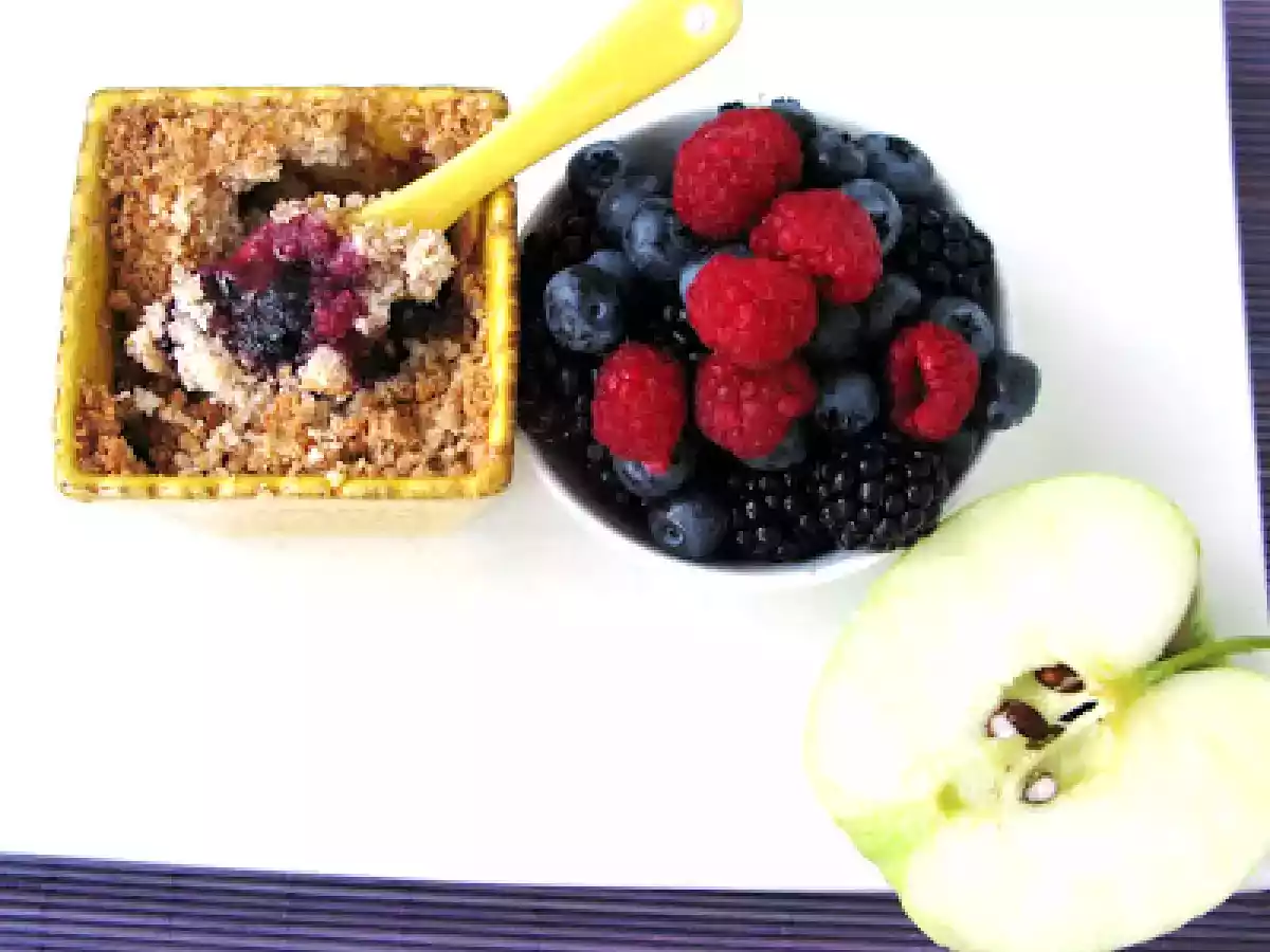 Crumble alle mele , frutti rossi e lamponi PrecedenteProssimo Dessertfacile40 min206 Kcal Invia questa ricetta ad un amico Stampa la ricetta Contatta l'autore della Ricetta Pubblica la foto di questa ricetta Ingredienti 4 1 mela 50 g lamponi 50 g more 50 g mirtilli 25 g zucchero di canna 25 g burro salato 25 g farina di mandorle 25 g farina integrale 1 /2 limone succo 2 cucchiai zucchero