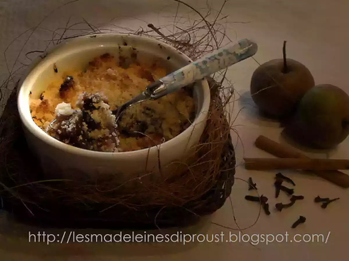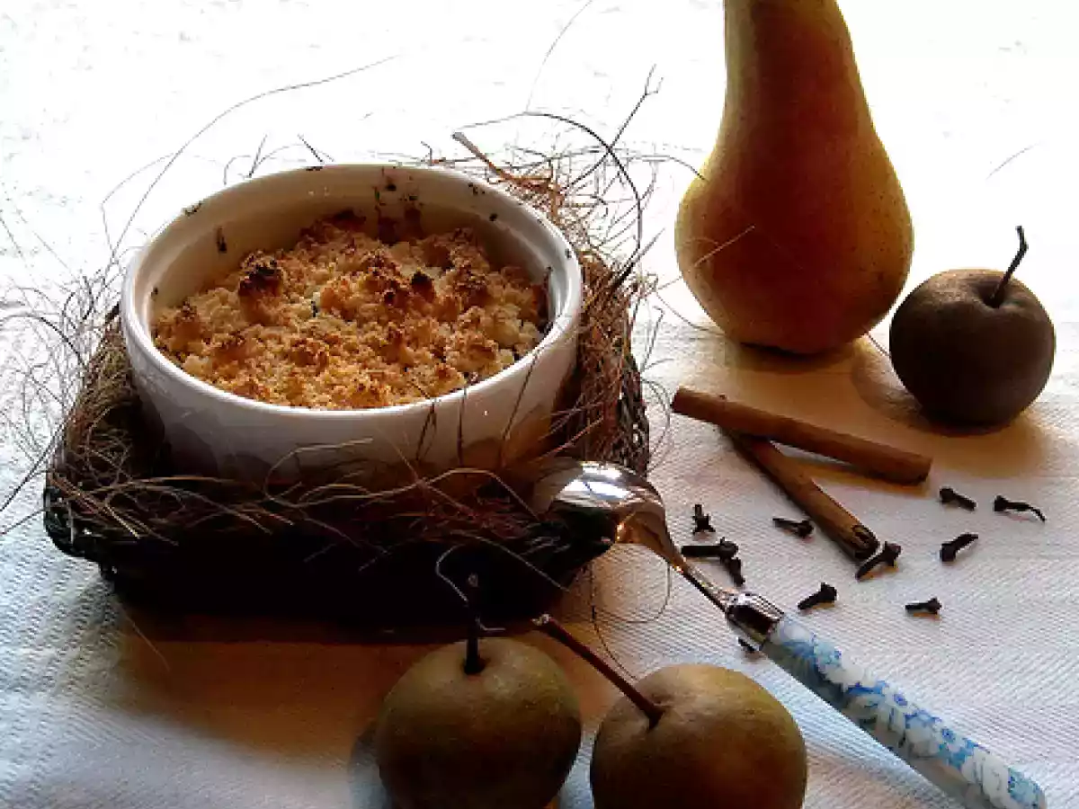 Crumble di farina di riso con pere al vino e cannella. PrecedenteProssimo Dessertfacile50 min321 Kcal Invia questa ricetta ad un amico Stampa la ricetta Contatta l'autore della Ricetta Pubblica la foto di questa ricetta Ingredienti 4 60 g di farina di riso 45 g di burro salato 45 g di zucchero di canna Per le pere al vino rosso: 2 pere poco mature e non tanto grandi 1/4 di litro di buon vino rosso 1,5 dl di acqua 100 g di zucchero di canna cannella e chiodi di garofano 1 cucchiaino di miele di acacia Costo stimato: 1.74Euros€ (0.44€/Porzioni)