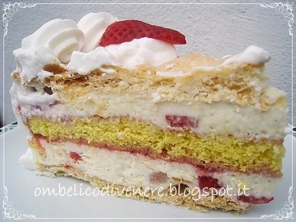 Diplomatico alle fragole PrecedenteProssimo DessertDifficile2 h 30 m Invia questa ricetta ad un amico Stampa la ricetta Contatta l'autore della Ricetta Pubblica la foto di questa ricetta torta con pasta sfoglia e chantilly alle fragole Ingredienti 7 pasta sfoglia rapida di Michel Roux: 250 gr di farina 250 gr di burro freddo 125 ml di acqua ghiacciata 1/2 cucchiaino di sale fino pan di spagna per rotoli di Giovanni Pina 65+25 gr di zucchero 8 gr di miele d'acacia 70 gr di tuorli (circa 4) 120 gr di albumi 55 gr di farina 45 gr di fecola crema pasticcera di Giovanni Pina: 60 gr di tuorli 85 gr di zucchero 20 gr di farina (sarebbero 16 gr di farina ma io ne ho messo qualche gr in più) 60 ml di panna 180 ml di latte bacca di vaniglia 1/4 colla di pesce 4 gr (mia aggiunta) per la crema chantilly alle fragole crema pasticcera 250 ml di panna zucchero a velo (da regolare in base al gusto) 15 fragole salsa alla fragola 6-7 fragole 1-2 zucchero per le decorazioni 300 ml di panna 30 gr di zucchero a velo 3 fragole ovetti di cioccolato