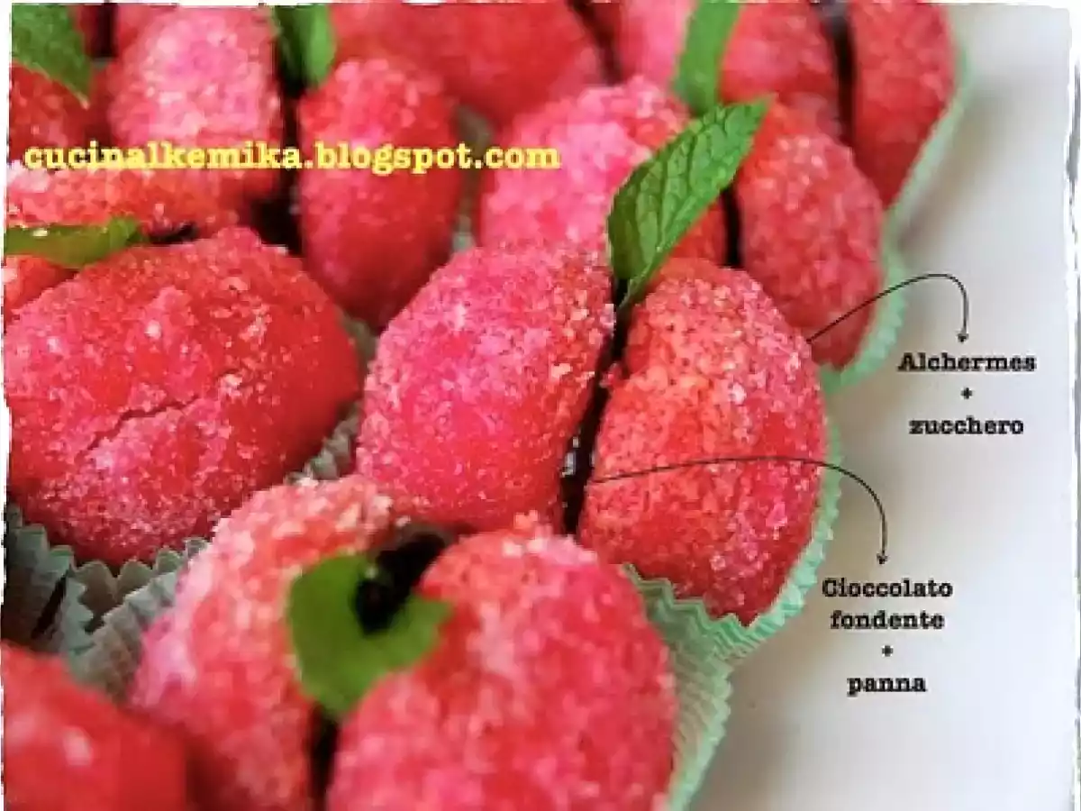 Dolci pesche all'alchermes e cioccolato vota adesso Dessertfacile50 min Invia questa ricetta ad un amico Stampa la ricetta Contatta l'autore della Ricetta Pubblica la foto di questa ricetta Ingredienti 4 250 g di farina 70 g di burro 70 g di zucchero 2 uova 1 bustina di lievito in polvere Per la colorazione: 300 g di zucchero semolato 200 g di alchermes 100 g di acqua Per la farcitura: 100 g di buon cioccolato fondente al 70% di cacao 2 cucchiai di panna