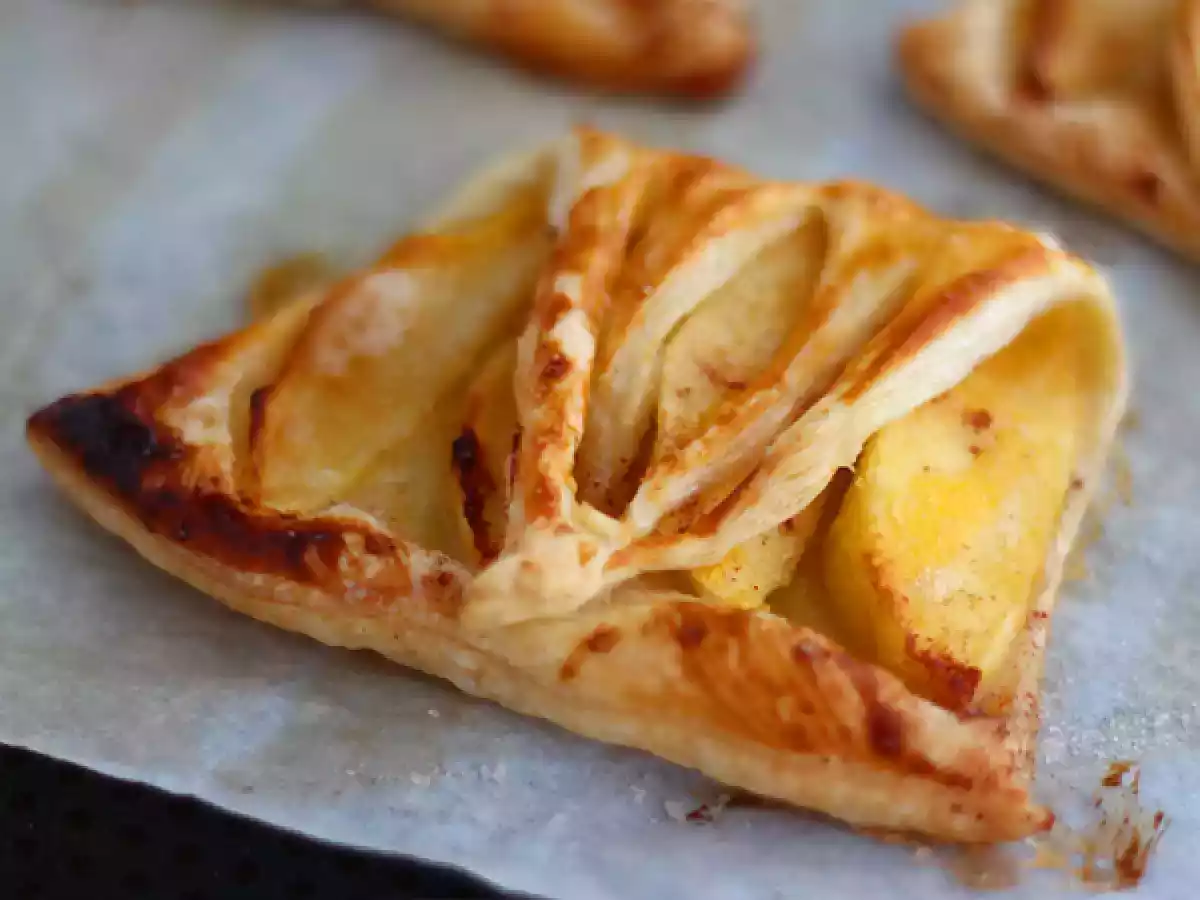 Sbucciate le mele e tagliatele a fette spesse. Poi disponetele sulla pasta sfoglia (devono esserci 4 fette su ogni triangolo)