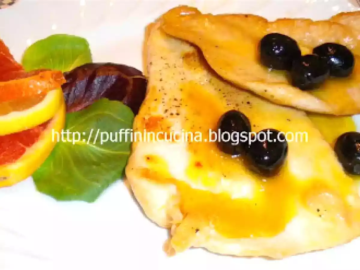 - Quando è bella dorata aggiungo il succo degli agrumi e le olive nere, di solito a rondelle, ieri sera avevo in casa solo olive intere.