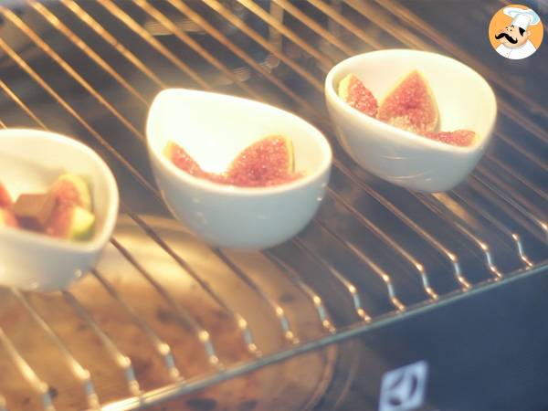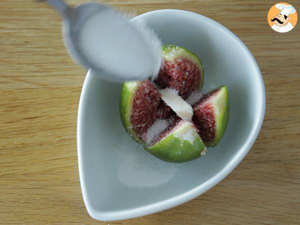 Mettete un fico in un piccolo piatto da forno e apritelo leggermente con le mani. Adesso aggiungete un pezzetto di burro e spolverate con un po' di zucchero