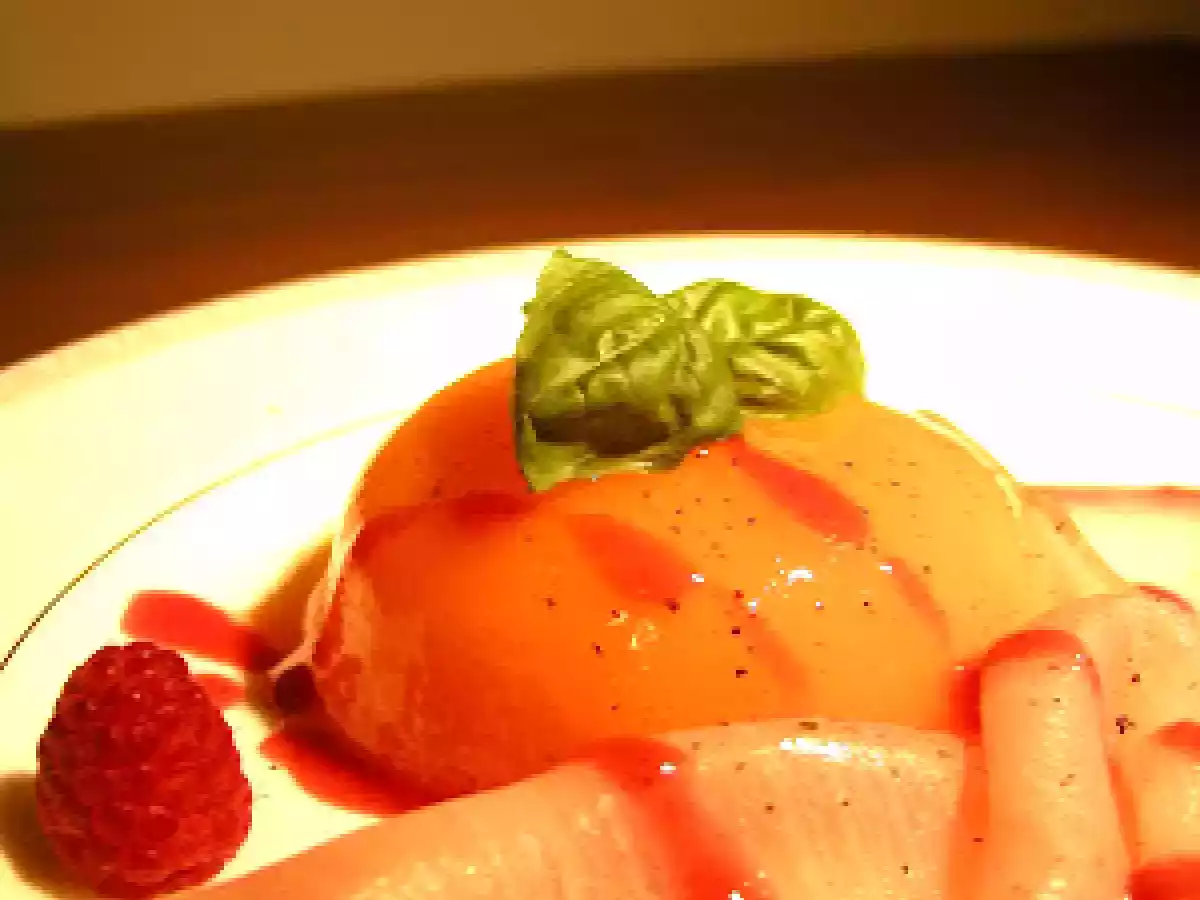 Gelatina di melone con spada affumicato e salsa di lamponi Dessertfacile25 min Invia questa ricetta ad un amico Stampa la ricetta Contatta l'autore della Ricetta Pubblica la foto di questa ricetta Ingredienti 2 Per la gelatina : 250 gr. melone 2,5 fogli di colla di pesce madera 1/2 foglia di menta 3 cucchiaini zucchero semolato Per la salsa : 100 gr. lamponi 1 o 2 cucchiai aceto bianco abbastanza dolce zenzero in polvere senape in polvere 2 cucchiaini zucchero semolato qlc. goccia succo di limone 100 gr. pesce spada affumicato pepe nero macinato al momento