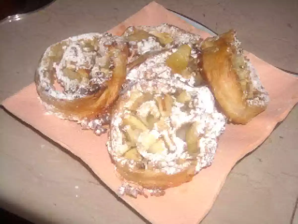 Girelle di sfoglia con le mele e mandorle Dessertfacile45 min281 Kcal Invia questa ricetta ad un amico Stampa la ricetta Contatta l'autore della Ricetta Pubblica la foto di questa ricetta Ingredienti 7 1 rotolo di pasta sfoglia 2 mele 50 gr di mandorle tritate 2 cucchiai di zucchero 3 cucchiai di liquore amaretto 2 cucchiai di miele Costo stimato: 4.47Euros€ (0.64€/Porzioni)