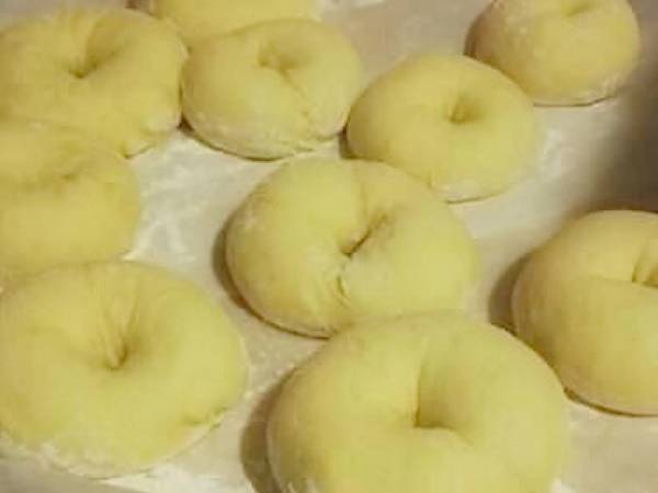Prendete nuovamente l’impasto e dividetelo in tanti pezzetti da g 60 circa ognuno, formate delle palline, ricavate un buco al centro di ogni pallina e adagiatele su una teglia foderata con carta forno.