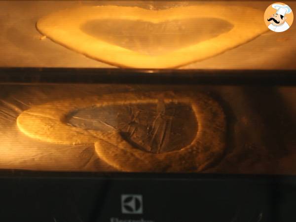 Ripetete la le tappe 3 e 4 con l'altro pezzo di pasta sfoglia rimasto. Ora mettete in frigo i fogli di carta da forno con l'impasto ritagliato per 30 minuti. Riprendetela, formate i 2 cuori ed eliminate l'impasto in più (dopo la permanenza in frigorifero la pasta si staccherà più facilmente)