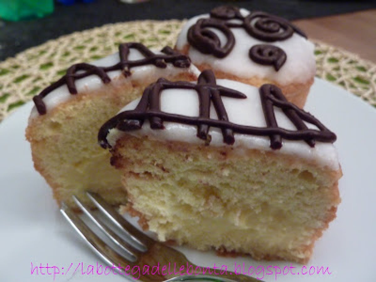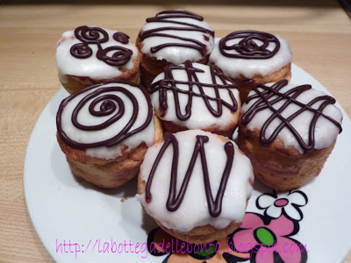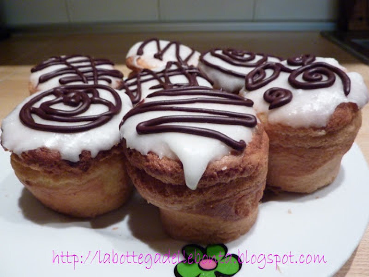 - Versate poi il composto in una sac a poche e riempiti gli stampini precedentemente imburrati e infarinati fin quasi al bordo. Spolverateli con zucchero a cvelo e infornate a 180° per 15 minuti, fate raffreddare e con un coltellino tagliate la parte centrale della base e svuotate.