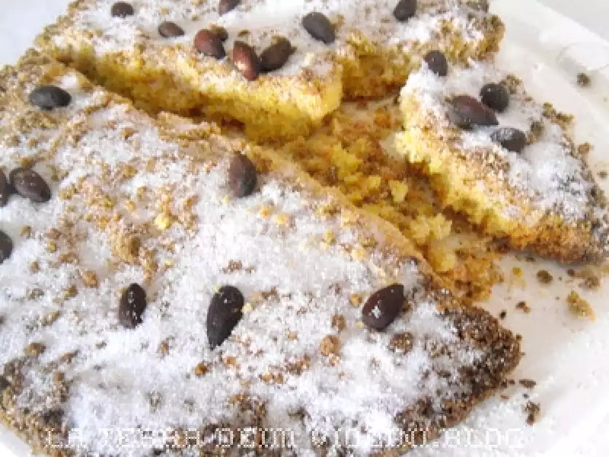 Foderare con questo briciolame una tortiera, io consiglio quelle rotonde usa e getta, con il bordo basso, di cm 26 di diametro, perché è molto più semplice , una volta lasciata raffreddare, da togliere.Cospargere di mandorle
