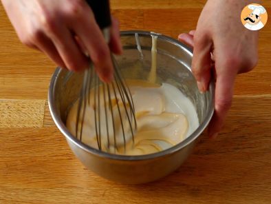 Sbattete i tuorli con lo zucchero fino a quando il composto si schiarisce e diventa cremoso. In una ciotola a parte mescolate la maizena con il latte rimasto, poi incorporate il composto che avete preparato precedentemente.