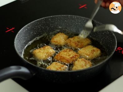 Riscaldate l'olio per la frittura in una padella e disponetevi qualche cubo di crema. Cuocete tutti i lati fino a quando non risultano ben dorati, poi adagiateli sulla carta assorbente
