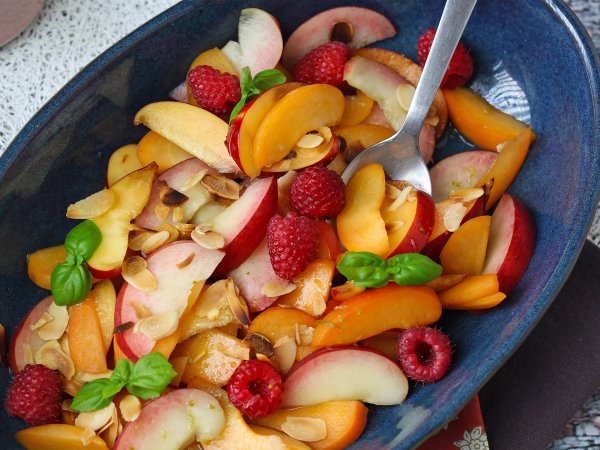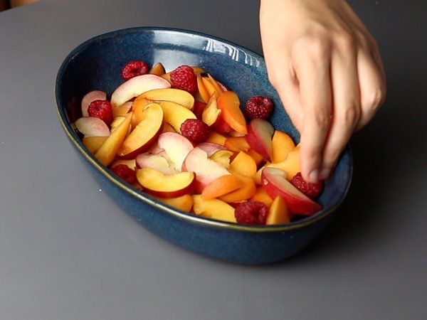 Macedonia estiva facile con frutta di stagione: pesche, albicocche e lamponi