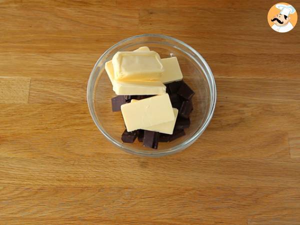 Fate fondere il cioccolato con il burro. Aggiungete al composto ancora caldo i fogli di gelatina ben strizzati e mescolate fino a quando saranno incorporati perfettamente
