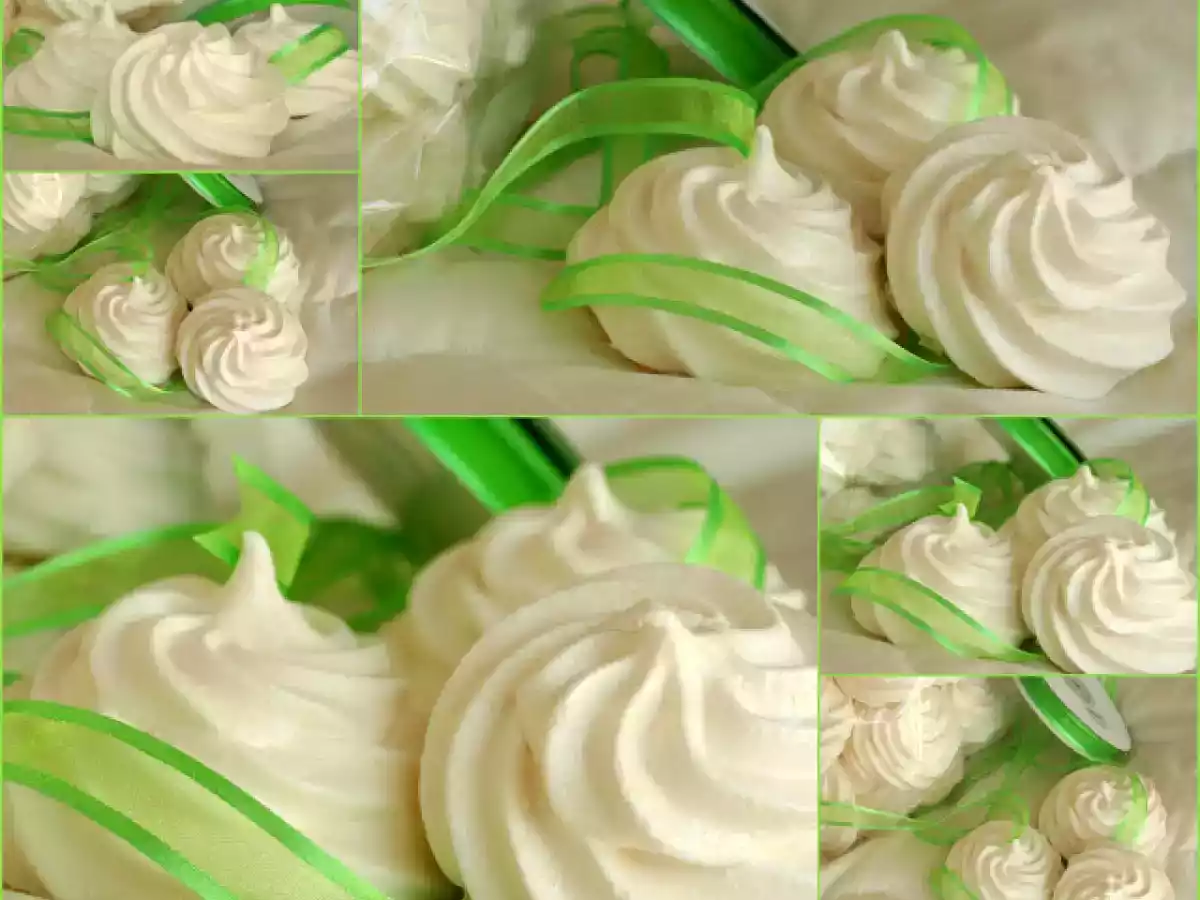 - La meringa svizzera: è sempre una meringa cotta molto simile a quella italiana ma anche meno stabile. Si prepara sempre con le proporzioni 1:2 ma a differenza della meringa italiana, i bianchi e lo zucchero sono messi insieme in una bastardella sopra il vapore della acqua non ancora in ebollizione.