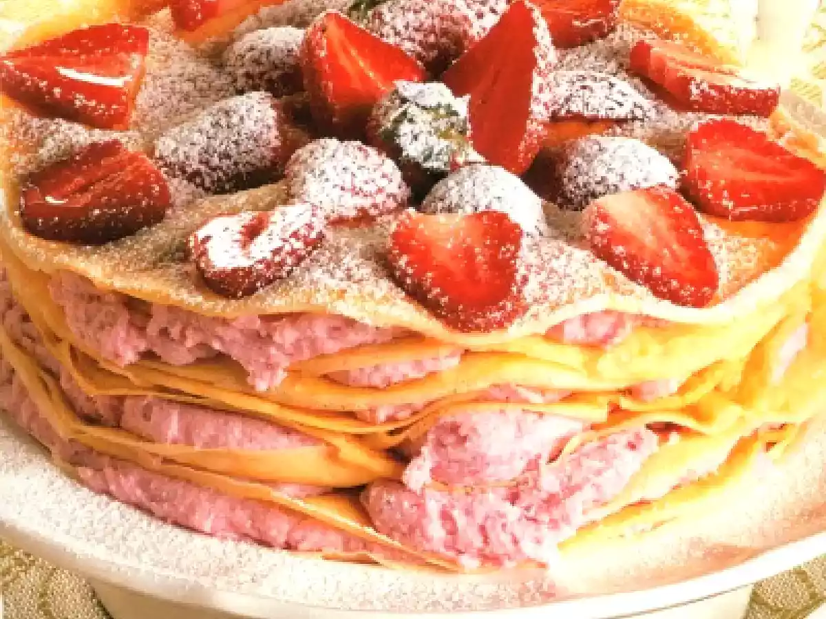 Torta millefoglie realizzata con tante crepes e una squisita mousse di fragole. La ricetta è semplicissima, provatela subito!