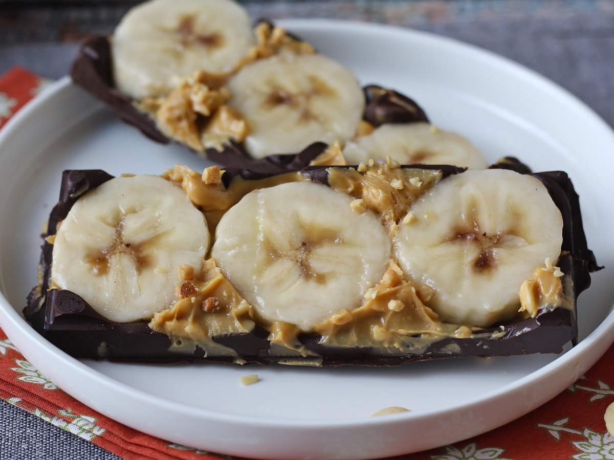 - Carta da forno: disponi le fettine di banana su un foglio, aggiungi burro di arachidi (crunchy o cremoso + arachidi tritate), poi ricopri con cioccolato fuso. Una volta indurito, spezza in pezzi grandi o piccoli. Perfetto da condividere!