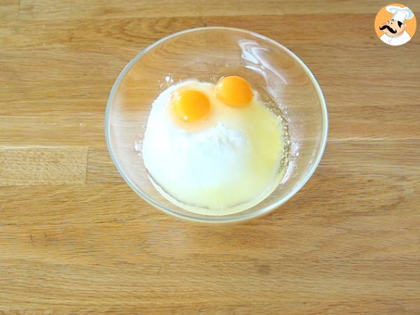 Mescolate la farina con lo zucchero, il sale e le uova. Aggiungete il burro fuso e la panna fresca. Quindi mescolate per bene.