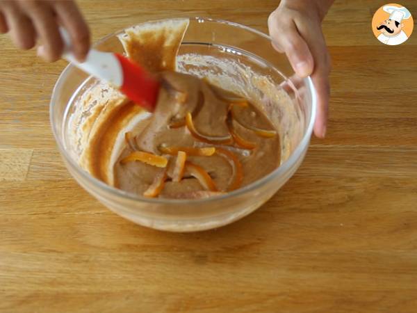 A questo punto aggiungete l'uovo e le scorzette d'arancia candite. Mescolate. Infine, versate la preparazione in un stampo da plumcake imburrato ed infornate a 180°C per 30 minuti.