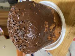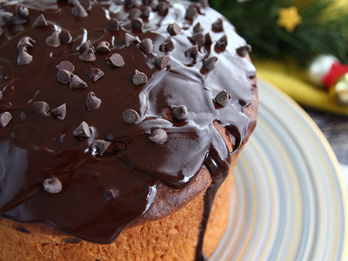 Lasciate raffreddare. Sciogliete insieme il burro ed il cioccolato poi utilizzate questa preparazione per ricoprire la parte superiore del vostro panettone. Per finire aggiungete qualche pepita di cioccolato.