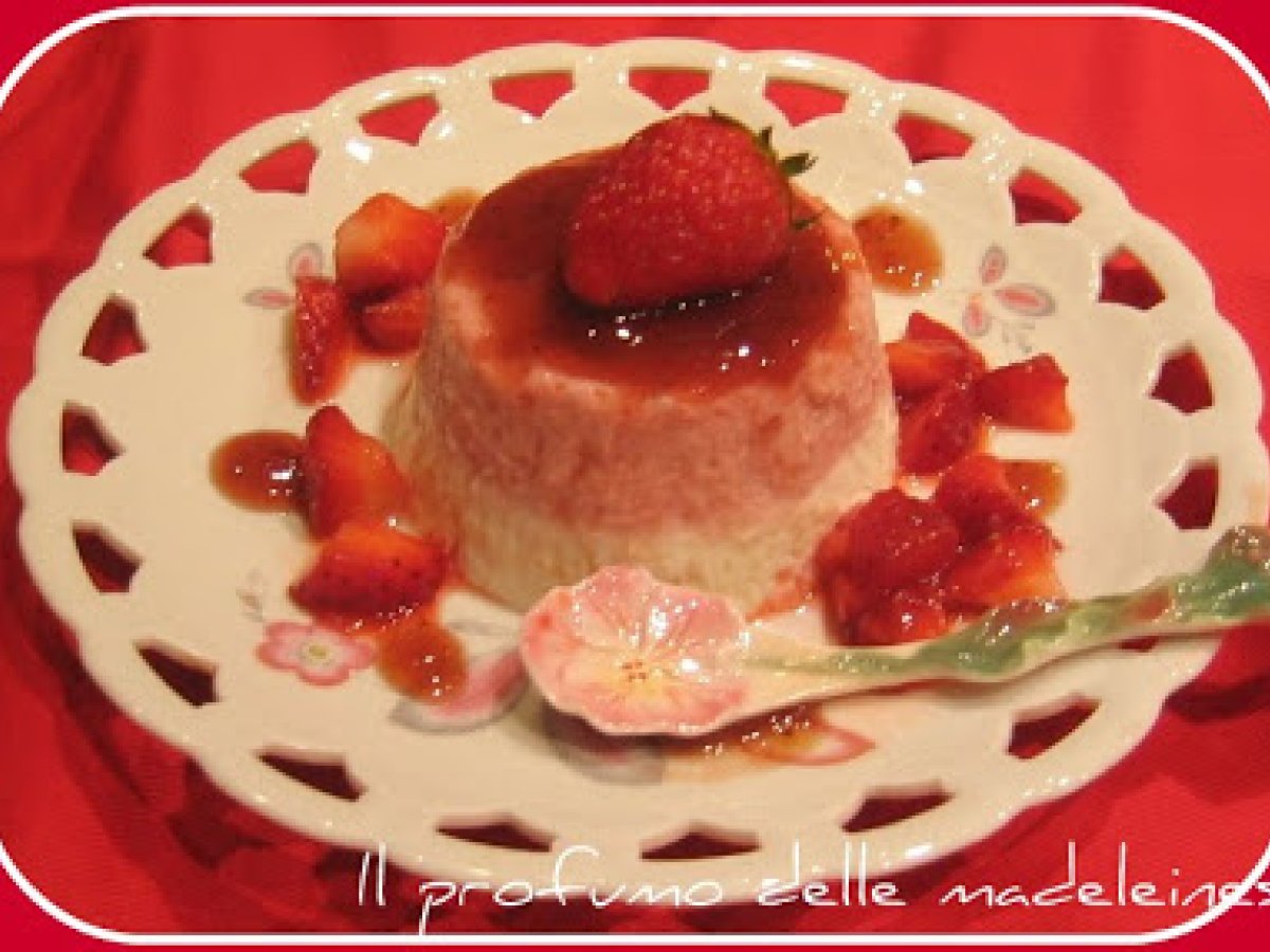 Panna cotta bicolore alle fragole vota adesso Dessertfacile45 min Invia questa ricetta ad un amico Stampa la ricetta Contatta l'autore della Ricetta Pubblica la foto di questa ricetta Ingredienti 6 750 g di panna fresca 300 g di fragole 120 g di zucchero a velo 14 g di gelatina in fogli 1 baccello di vaniglia Per la guarnizione circa 200 g di fragole + 6 fragole piccole da lasciare intere qualche cucchiaio di marmellata di fragole 2 cucchiai di liquore alle fragole (facoltativo)