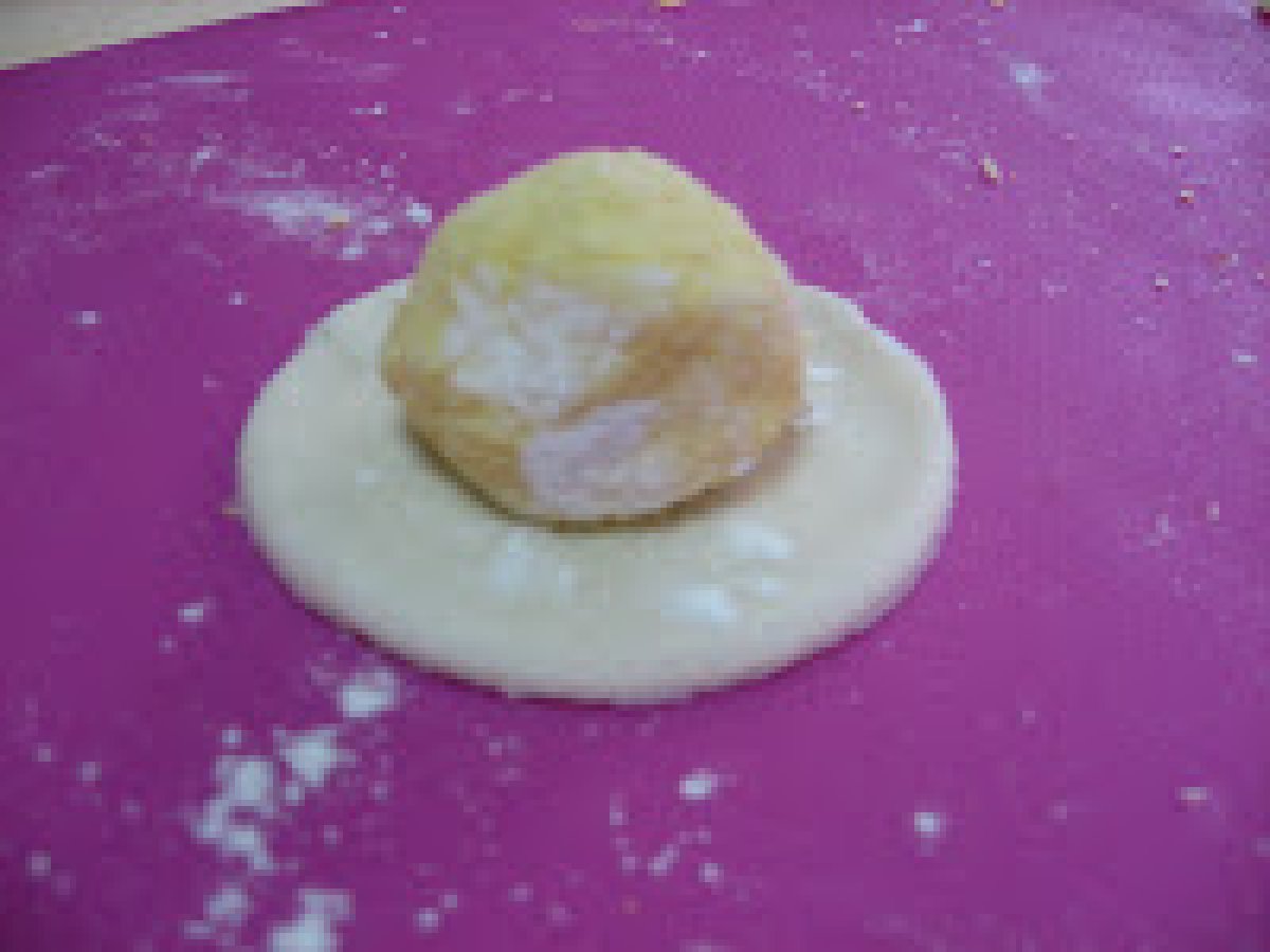 - Adesso adagiare al centro dei dischetti le palline di ripieno e pizzichiamo i bordi del dischetto, in modo tale che abbraccino la pallina di ripieno.