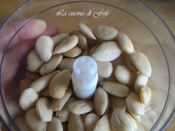 Per preparare la pasta di mandorla base per realizzare questi pasticcini, iniziate dal ridurre le mandorle in farina. Se userete la farina, saltate questo passaggio. Inserite in un mixer dotato di lame di acciaio le mandorle pelate intere precedentemente tostate in padella pochi minuti (fig. 1).