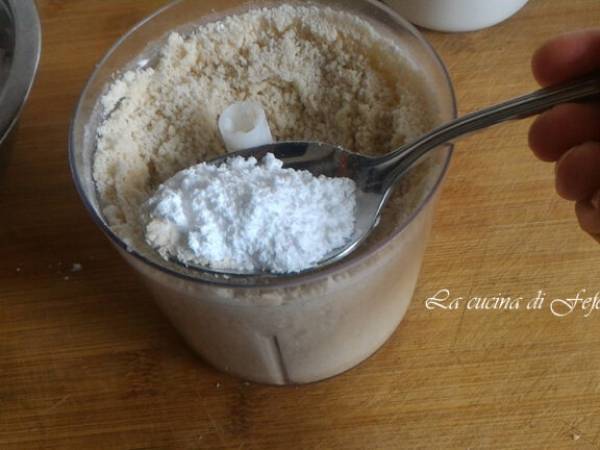 Tritate a più riprese per non surriscaldare troppo la frutta a guscio che altrimenti rilascerebbe il suo olio, e riducetele in polvere, quindi aggiungete lo zucchero a velo precedentemente setacciato poco alla volta (fig. 2).