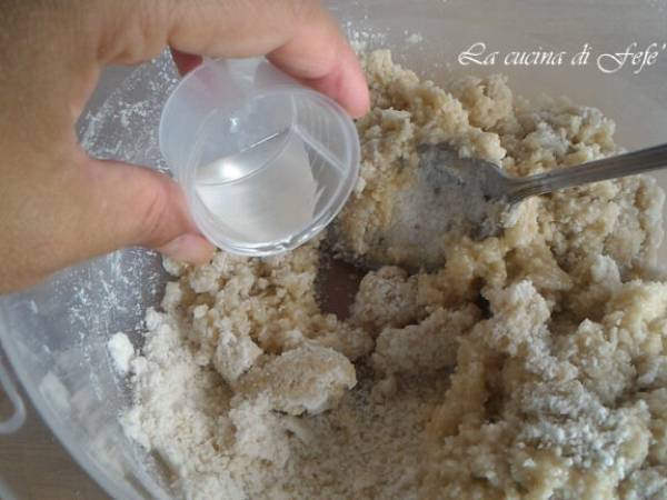 Aggiungete gli albumi non montati a neve, ma solo leggermente schiumati con una forchetta e continuate a mescolare (fig. 5).