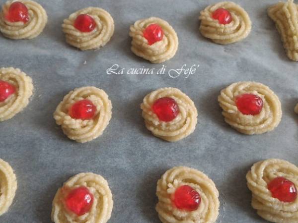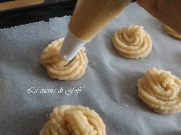 *** L’altezza dei pasticcini è molto importante, poiché, se sono troppo bassi, tenderanno ad asciugarsi troppo in cottura, mentre se farete più giri, rischiate che restino crudi. Mi raccomando quindi, la particolarità di questi dolcetti è la croccantezza solo in superficie, ma dentro dovranno essere ancora morbidissimi.