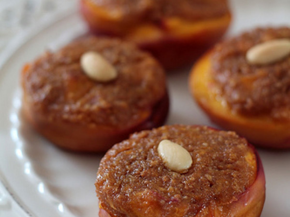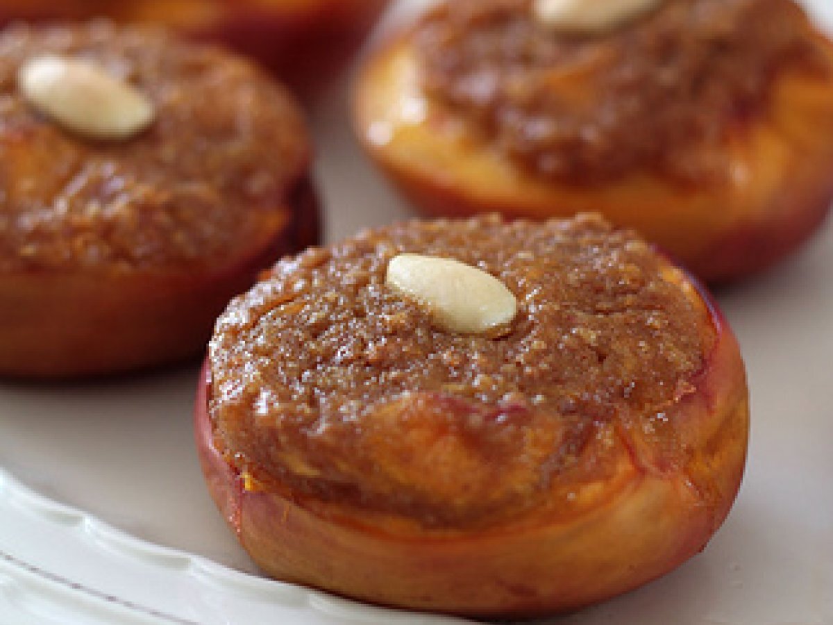 Pesche al forno ripiene aromatizzate all'amaretto di saronno PrecedenteProssimo Dessertfacile1 h 5 m Invia questa ricetta ad un amico Stampa la ricetta Contatta l'autore della Ricetta Pubblica la foto di questa ricetta Una ricetta semplice e ricca di gusto. Un dessert che delizioso! Ingredienti 3 3 nettarine mature ma sode 60 g di Digestive 60 g di amaretti 2 cucchiai di zucchero di canna 1 cucchiaio di Amaretto di Saronno 6 mandorle pelate intere