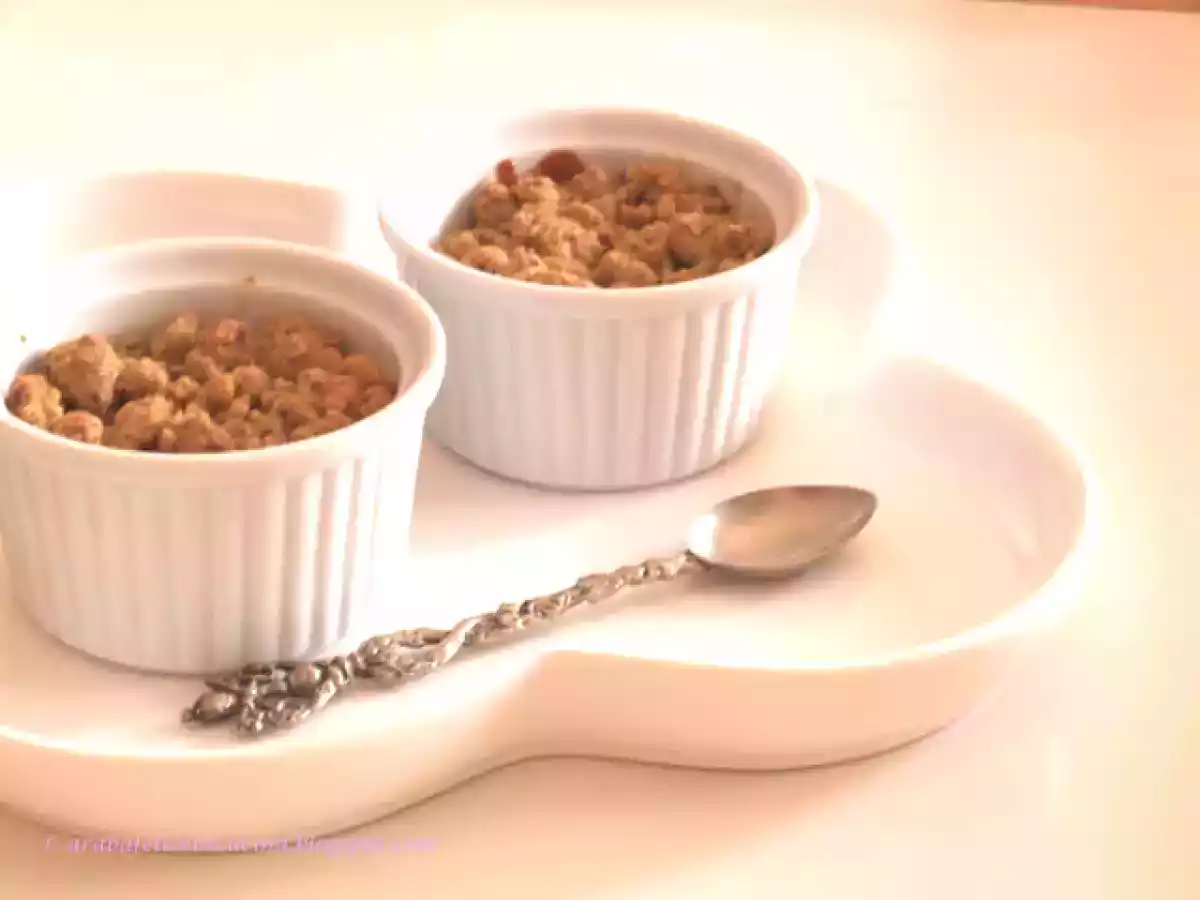 Pesche in crumble di pistacchi ed avena vota adesso PrecedenteProssimo Dessertfacile1 h 15 m Invia questa ricetta ad un amico Stampa la ricetta Contatta l'autore della Ricetta Pubblica la foto di questa ricetta Ingredienti 4 Per il ripieno: 4 grosse pesche un cucchiaio raso di amido di mais 50 g di zucchero semolato il succo di un limone una grattata di noce moscata Per il crumble: 60 g di pistacchi tritati 65 g di farina 30 g di fiocchi d'avena la punta di un cucchiaino di lievito per dolci la punta di un cucchiaino di sale 85 g di burro 3 cucchiai di zucchero di canna