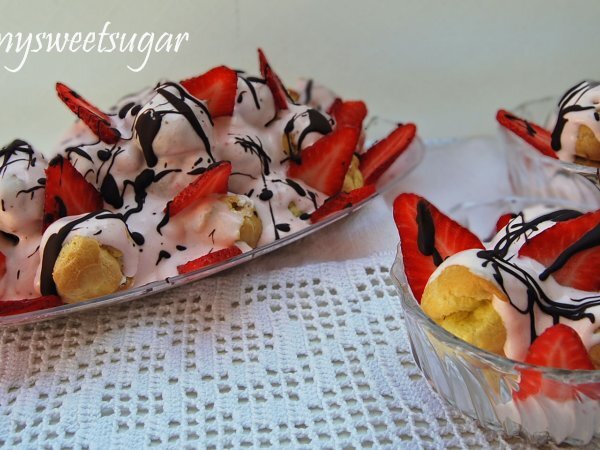 riepire bignè con fragole e panna e distribuire sopra la crema