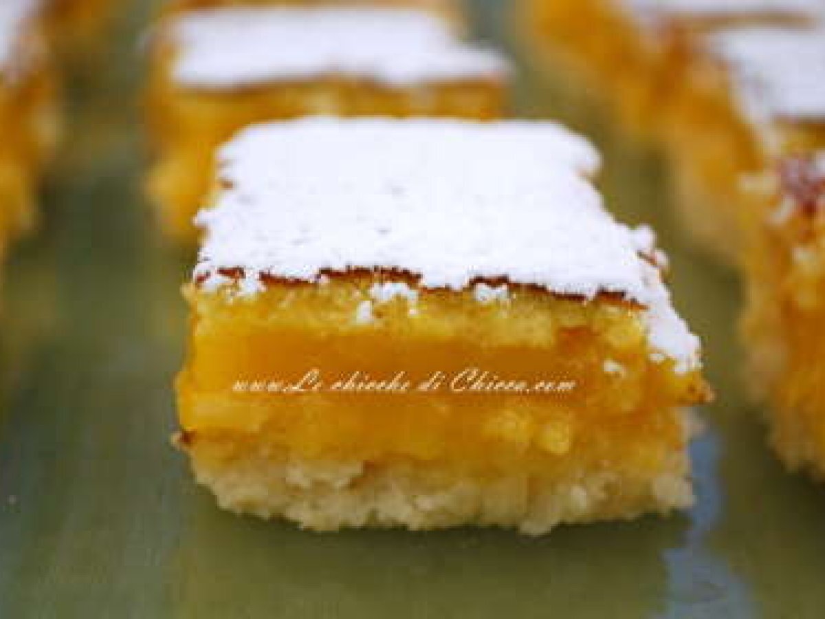 Quadrotti di shortbread al limone PrecedenteProssimo Dessertmedia1 h 20 m314 Kcal Invia questa ricetta ad un amico Stampa la ricetta Contatta l'autore della Ricetta Pubblica la foto di questa ricetta Una ricetta estremamente golosa Ingredienti 8 Per lo shortbread: 113 g burro a temperatura ambiente 25g di zucchero 140 g di farina 1/8 di cucchiaino di sale Ingredienti per la crema: 200 g zucchero 2 uova 80 ml di spremuta di limone (circa due limoni) 25 g di farina Zucchero a velo per guarnire Costo stimato: 1.89Euros€ (0.24€/Porzioni)