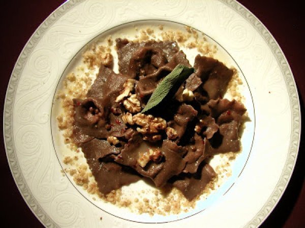 Ravioli di cacao al castelmagno con burro speziato Dessertfacile1 h 10 m Invia questa ricetta ad un amico Stampa la ricetta Contatta l'autore della Ricetta Pubblica la foto di questa ricetta Ingredienti 2 Per la pasta : 80 g farina bianca 10 g cacao amaro 20 g semola di grano duro 1 uovo + 1 tuorlo olio e.v.o. sale Per il ripieno : 90 g castelmagno 100 g ricotta vaccina 1 cucchiaio parmigiano reggiano grattugiato Per il condimento : 20 g burro bacche di pepe rosa pestate pepe bianco macinato cannella macinata noce moscata grattugiata zenzero in polvere erbe aromatiche maggiorana noci miele di castagno per decorare il piatto