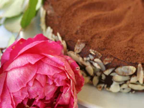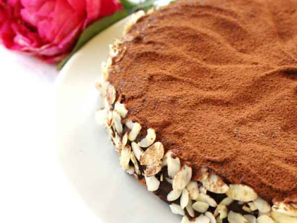 - Alzare il cioccolato dall'acqua calda e aggiungerlo al burro un po' per volta amalgamando bene con una frusta. Quindi sbattere il composto sopra una ciotola di acqua e ghiaccio continuando a miscelare fino ad ottenere una consistenza spalmabile. Distribuirlo sulla torta con una spatola e decorare con mandorle a scaglie.