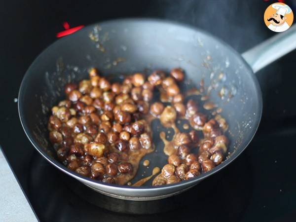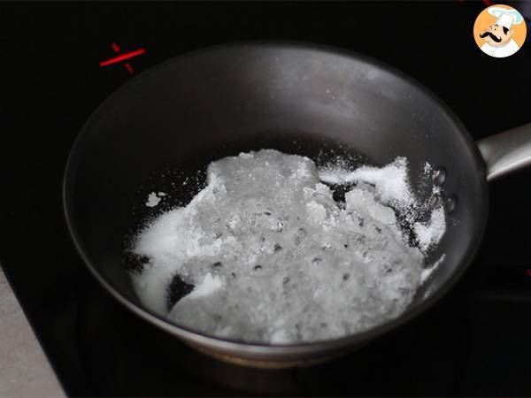 Mettete l'acqua e lo zucchero in una padella a fuoco medio. Quando iniziano a formarsi delle bolle aggiungete le nocciole