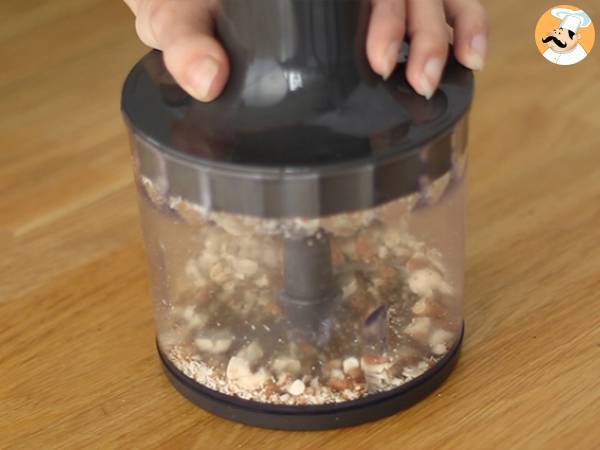 Tritate grossolanamente i 30 gr di nocciole, poi mescolate per bene con la crema (o la Nutella) e mettete da parte.