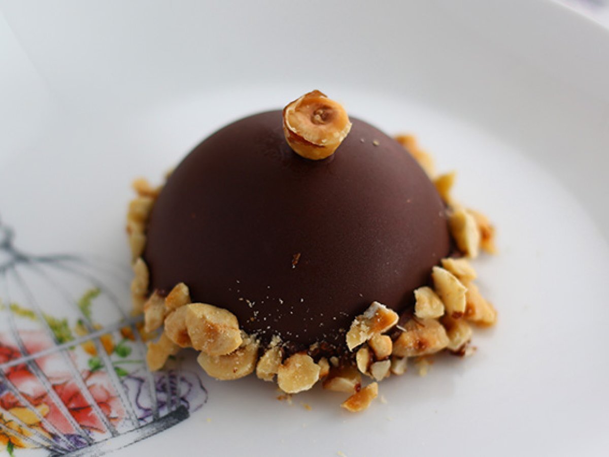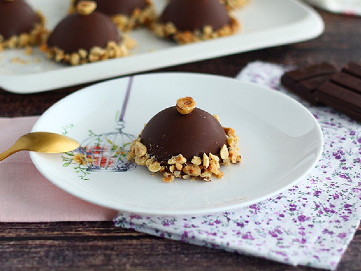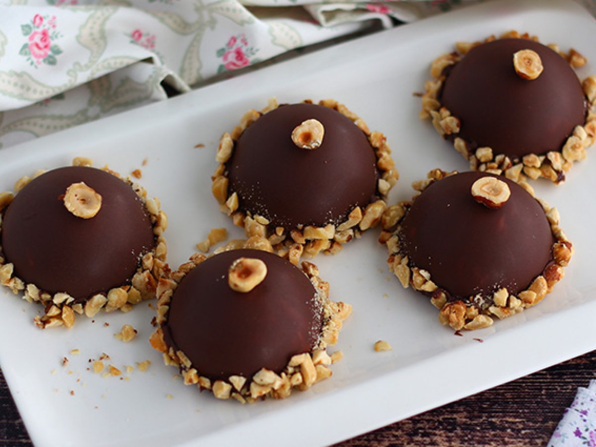 Sciogliete un po' di cioccolato al latte che utilizzerete come colla per fissare le nocciole sulla base delle semisfere di cioccolato. Per finire collocate una mezza nocciola sulla sommità del dessert.