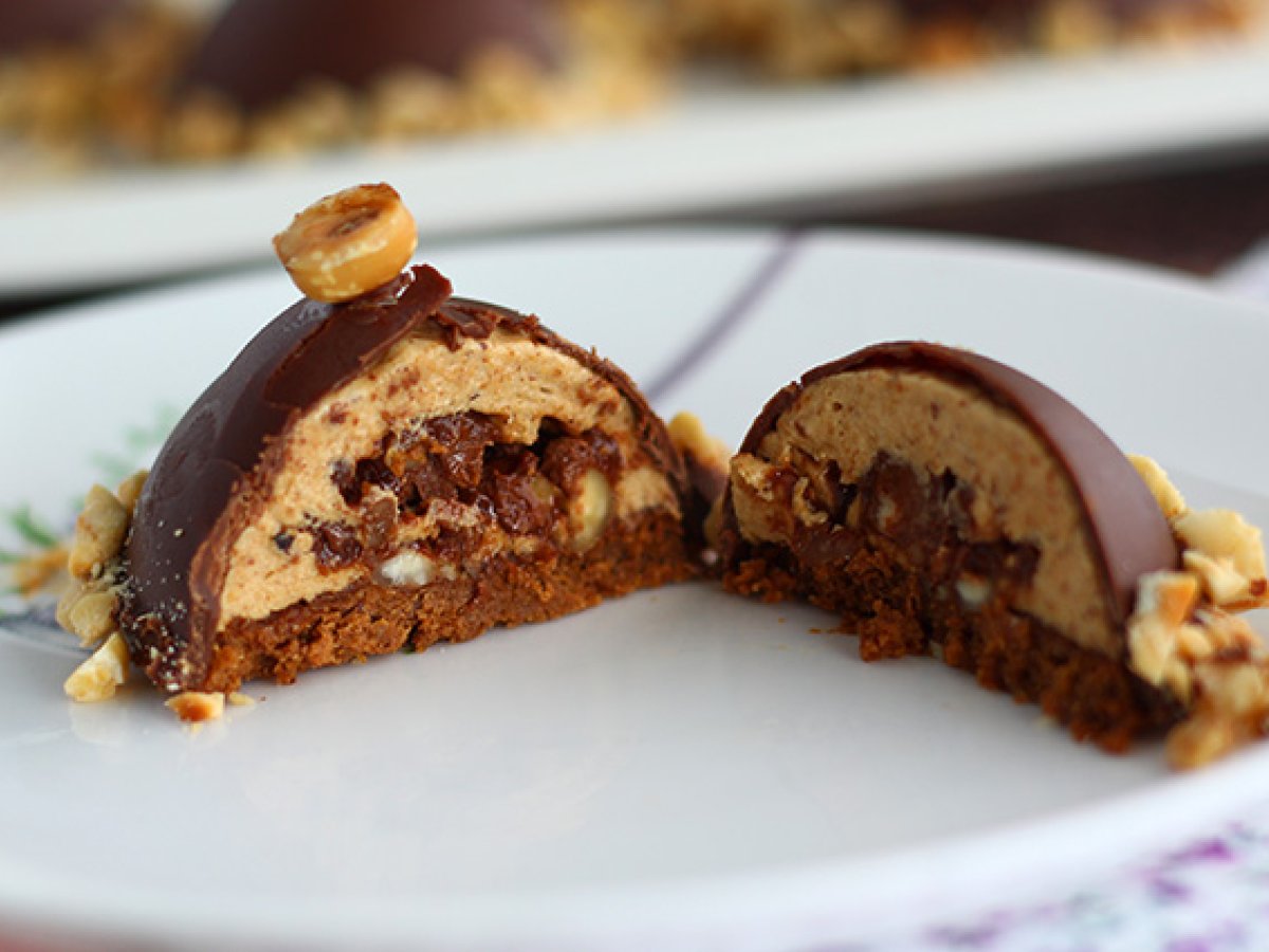 Togliete dal frigo le semisfere di cioccolato e riempitele leggermente con la mousse di pralinato, poi aggiungete un cucchiaino di cuore di nocciola preparato in precendenza