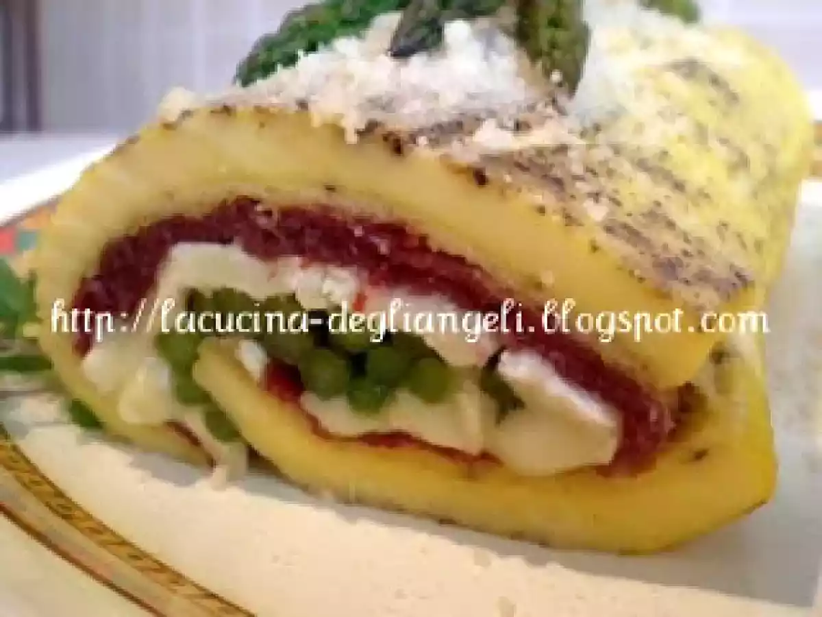 Rotolo di frittata al brie, bresaola e asparagi vota adesso PrecedenteProssimo Dessertfacile1 ora Invia questa ricetta ad un amico Stampa la ricetta Contatta l'autore della Ricetta Pubblica la foto di questa ricetta Ingredienti 4 8 uova 120 g di bresaola della valtellina 150 g di brie 150 g di asparagi freschi 40 g di parmigiano grattugiato qualche fogliolina di maggiorana e timo freschi Sale e pepe Q.B.