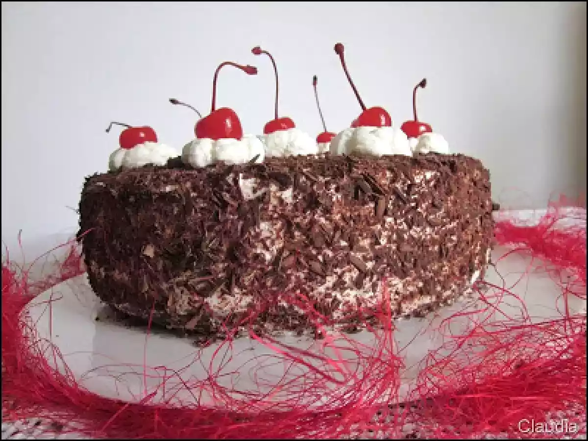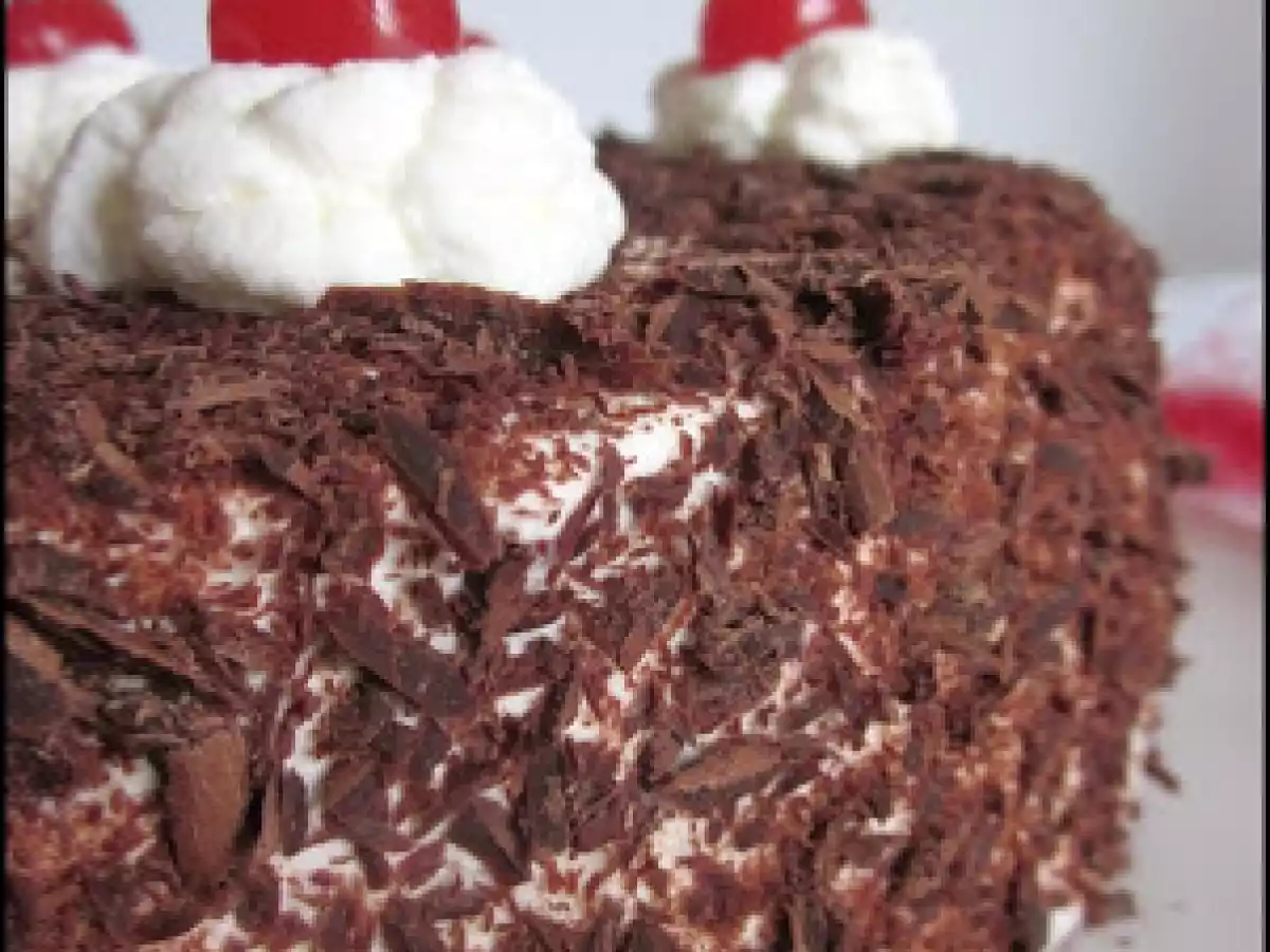 Schwarz..walden..kirs..che??? torta foresta nera! PrecedenteProssimo Dessertfacile1 h 20 m Invia questa ricetta ad un amico Stampa la ricetta Contatta l'autore della Ricetta Pubblica la foto di questa ricetta Ingredienti 4 per la base: Pan di Spagna al Cioccolato 150 g di burro 180 g di cioccolato fondente 150 g di farina un pzzico di sale 6 uova 1 bustina di vanillina 1 bustina di lievito per guarnire: 400 g di marmellata di ciliegie 30 g di Maraschino Crema chantilly 250 ml di panna fresca da montare 60 g di zucchero a velo per decorare: ciliegie sciroppate trucioli di cioccolato