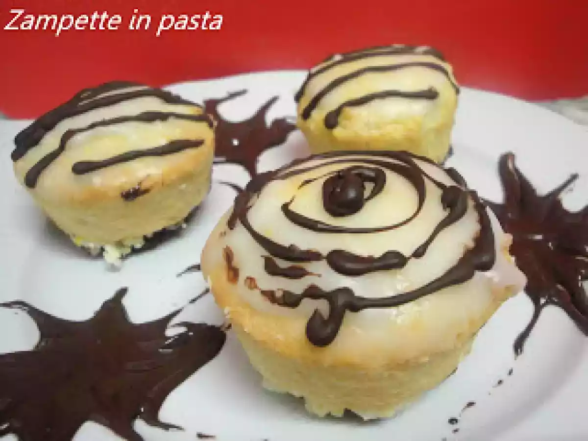 - Scaldate lo zucchero fondente e inzuppateci la parte superiore dei sospiri. Decorate i sospiri con righine di cioccolato fondente utilizzando un piccolo cono di carta forno. La cioccolata messa anche sulla base per coprire i bricioloni di pasta.