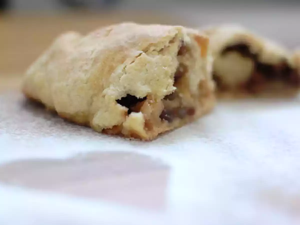 Strudel di mele con la pasta matta PrecedenteProssimo Dessertfacile55 min Invia questa ricetta ad un amico Stampa la ricetta Contatta l'autore della Ricetta Pubblica la foto di questa ricetta Ingredienti 2 pasta matta 150 g di farina 1uovo 1 pizzico di sale 50 g di burro sciolto RIPIENO 2 mele grandi o tre piccole tagliate sottili 1 cucchiaio di zucchero di canna 50 g di uvetta un po' di pinoli cannella